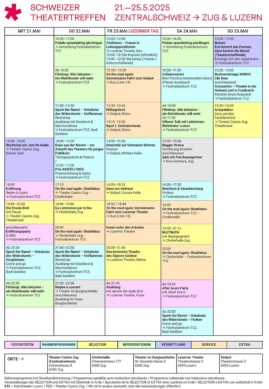 Der wichtigste Event der Schweizer Theaterszene findet in Partnerschaft mit dem Theater Casino Zug, dem Luzerner Theater, dem Südpol Luzern, dem Burgbachkeller, der Chollerhalle, der Galvanik, dem Kinder-und Jugendtheater Zug und der Gewürzmühle zum ersten Mal in der Zentralschweiz statt.